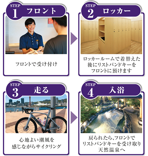 日帰り温泉ご利用の場合、280台収容の駐車場を最大7時間無料でご使用いただけます。またご滞在時間中、ロッカーが自由にお使いいただけるので、お着替えや荷物の心配をすることなく、快適なサイクリングをお愉しみいただけます。